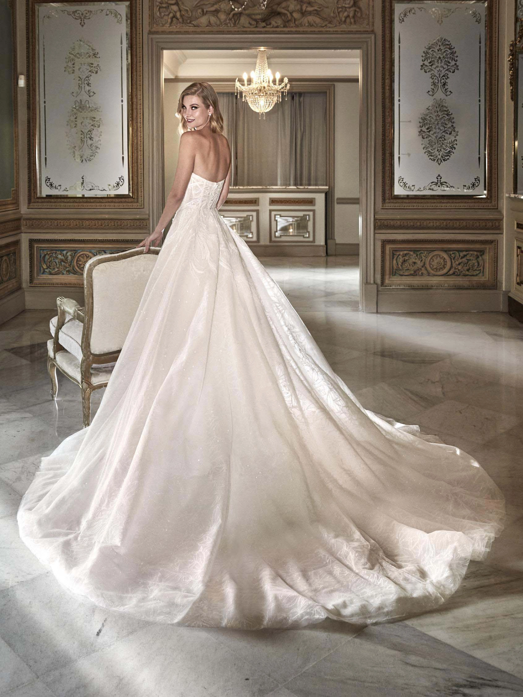 Un hermoso vestido by PRONOVIAS PRIVEE. Es un modelo en línea A con escote en corazón, adornado con glitter, encaje y perlas, para una presencia brillante y moderna. Ideal para novias que quieren impactar con lujo y estilo.