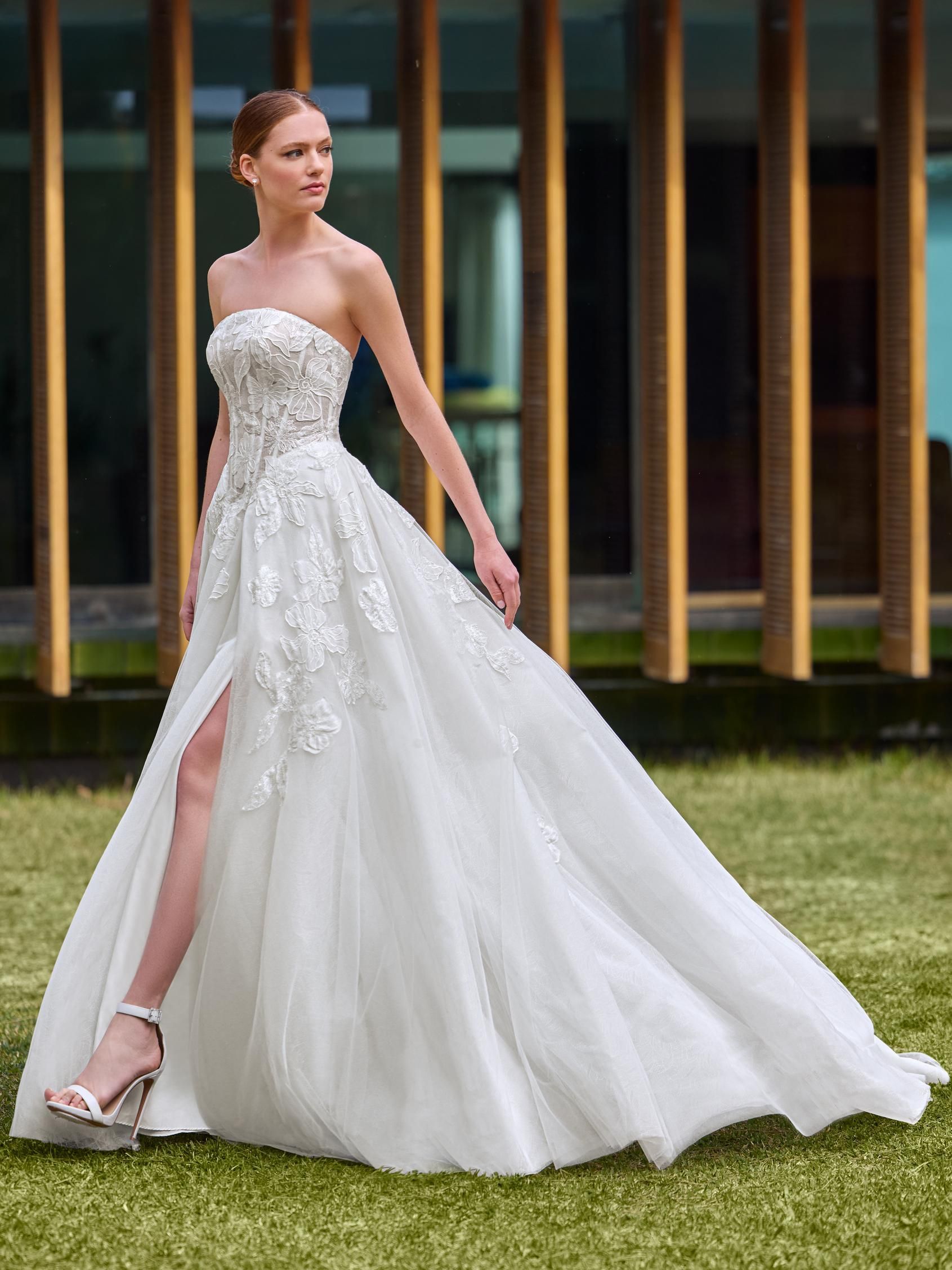 Hermoso vestido corte sirena, con un escote en pico. Confeccionado en crepe, un modelo minimalista perfecto para lucir elegante y moderna en tu gran día.  ADRIE es un modelo by PRONOVIAS.