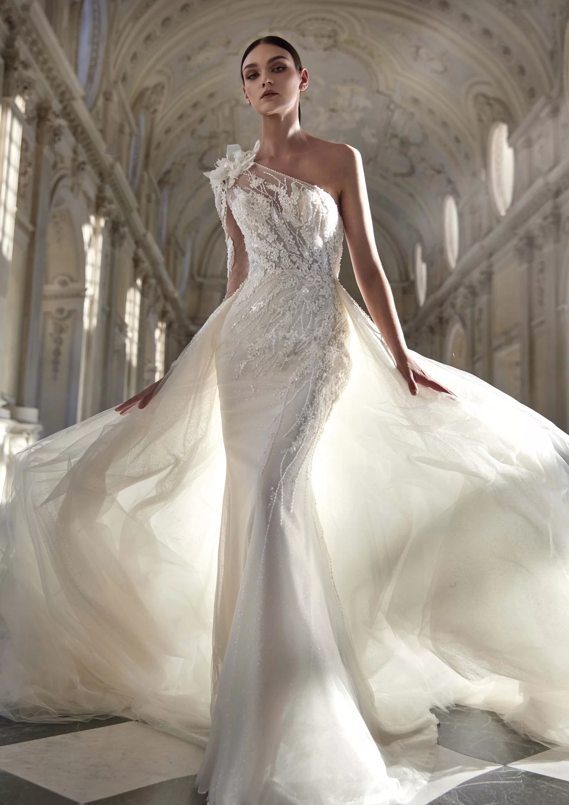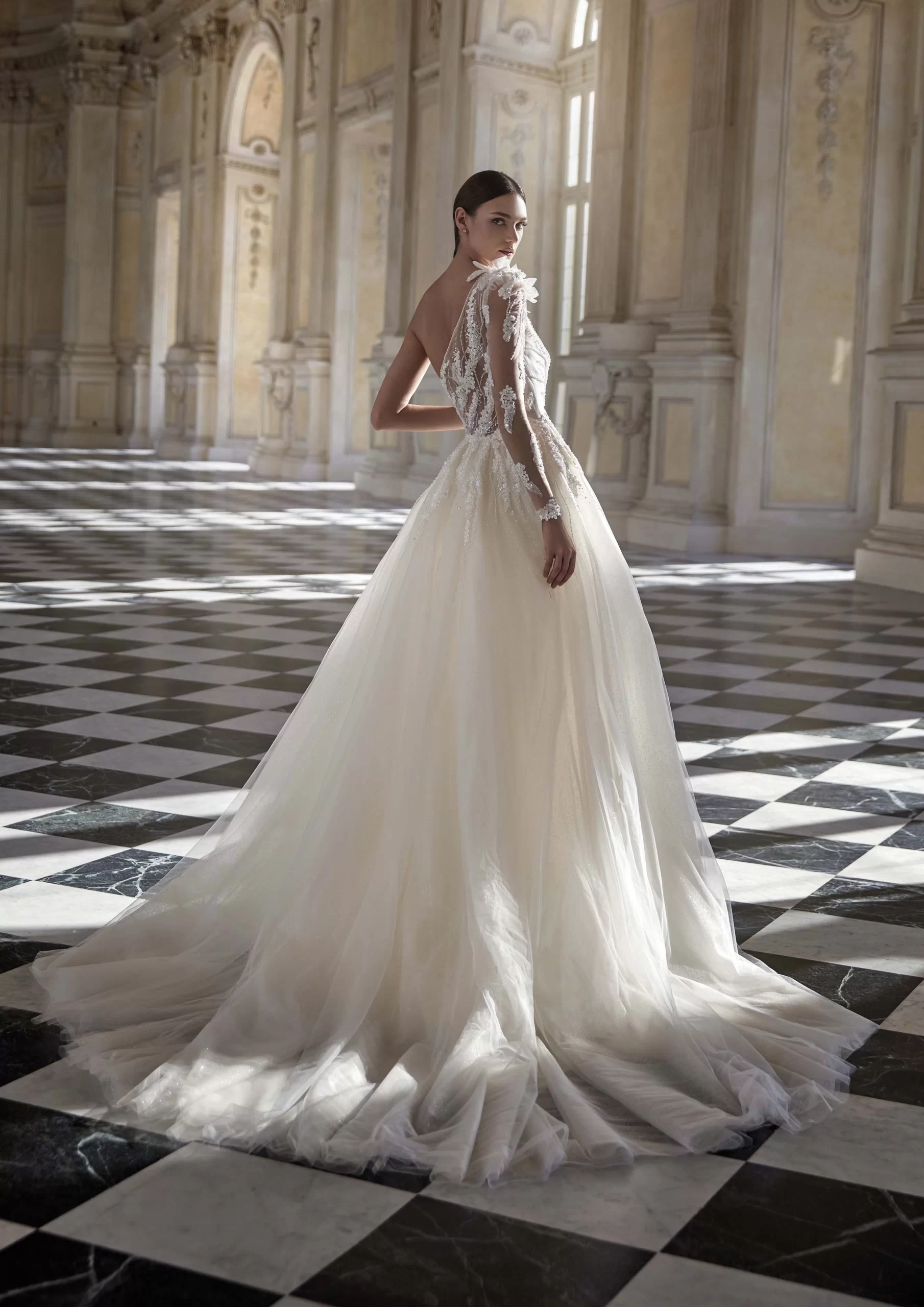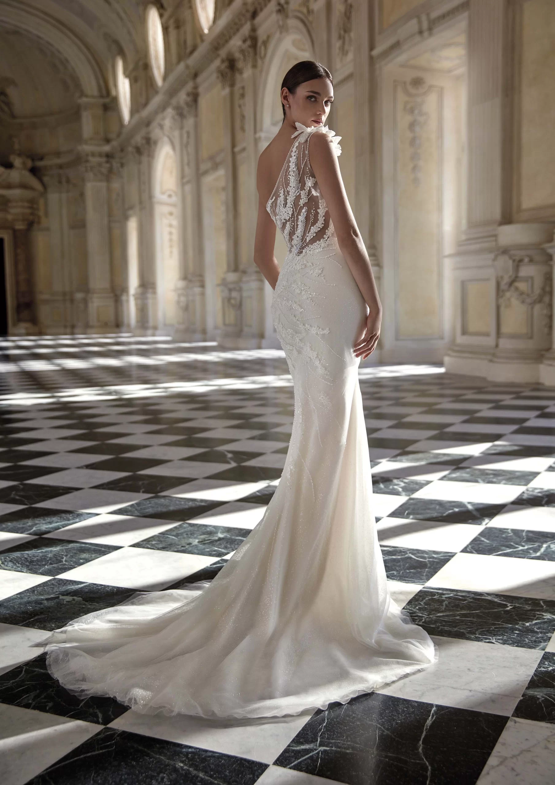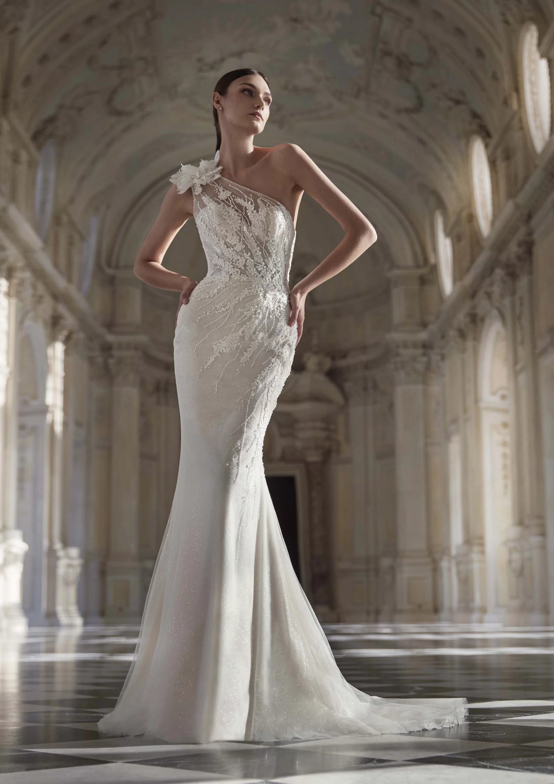 AGATIA es un hermoso modelo by PRONOVIAS. Un vestido corte sirena con un escote en forma de corazón, cubierto por encaje de transparencia. Lleva detalles florales que están en tendencia, también incluye una cauda sobrepuesta. Es un modelo ideal para una novia que desea elegancia y dramatismo en su gran día.