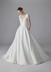 ASMARA es un hermoso vestido corte A, con un escote corazón y manga larga abullonada. Tiene una hermosa caída que aumenta el volumen del vestido. Es un modelo ideal para novias que desean un look minimalista pero que al mismo tiempo quieren un toque romántico y mágico en su boda. ASMARA es un modelo by PRONOVIAS.