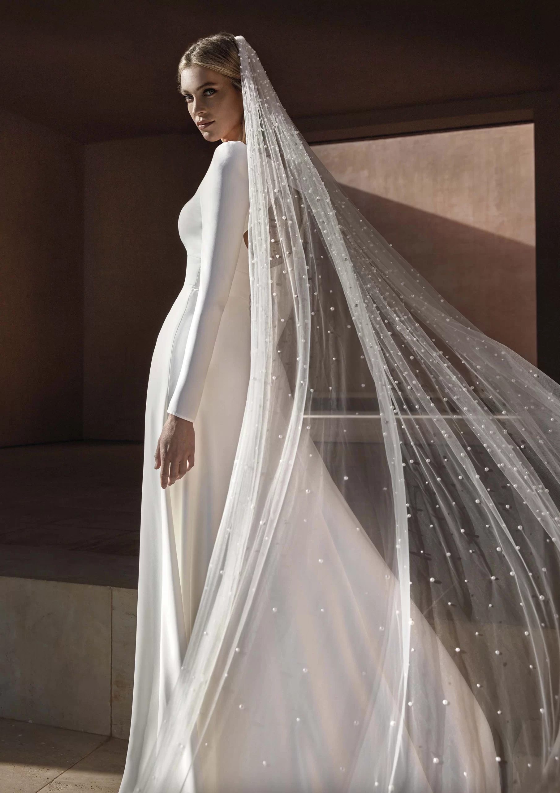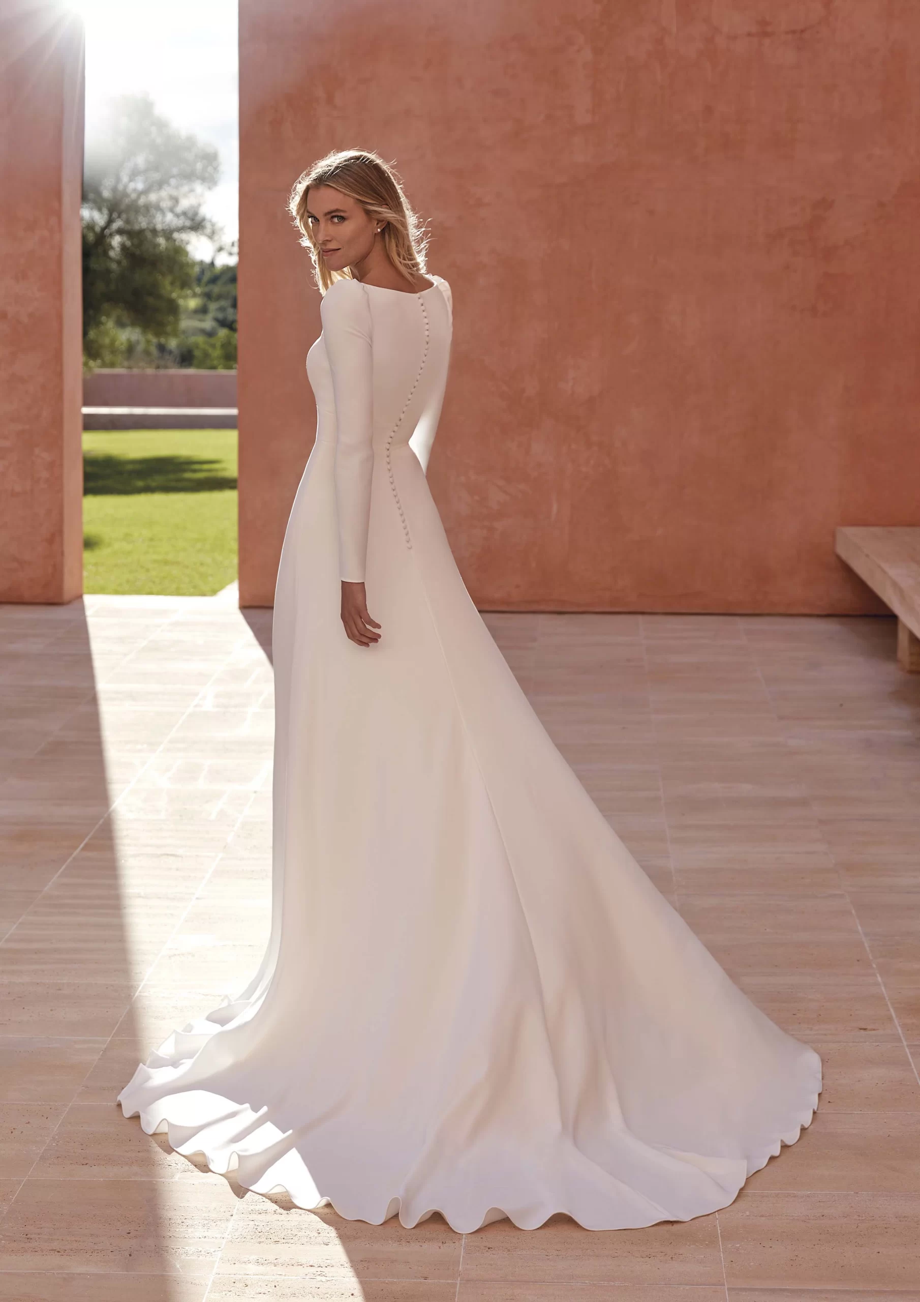 Vestido de novia by PRONOVIAS. Tiene un corte en A, escote cuadrado y manga larga. Este modelo está confeccionado en crepé. Su estilo modesto y minimalista es ideal para una novia elegante.
