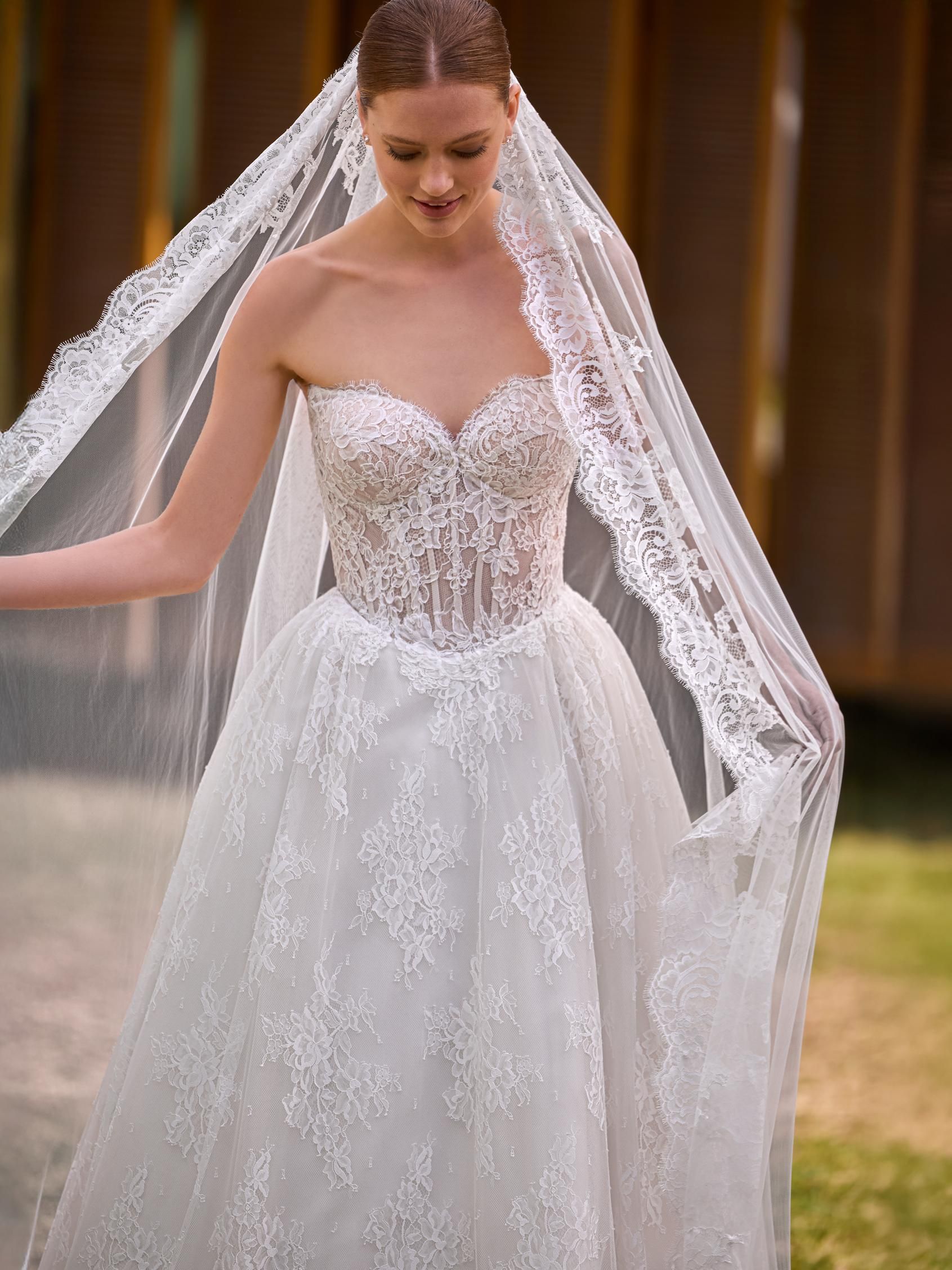 Este vestido de corte princesa con escote corazón combina una falda de volumen suave con un corpiño semitransparente y un top desmontable que permite transformar el look. El chantilly y el encaje se funden en una silueta romántica y moderna, pensada para una novia que busca versatilidad sin perder elegancia. BETJE es un modelo característico by PRONOVIAS.