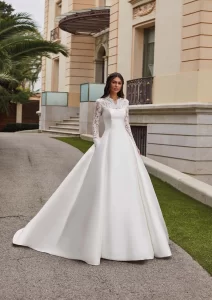 Vestido de corte sirena By PRONOVIAS PRIVEE. Tiene un escote en V en la espalda y mangas cortas, con detalles en glitter, tul y perlas. Además de eso, incluye una cauda extraíble que le da un efecto de vestido corte princesa. Ideal para una novia moderna que busca sofisticación y estilo en cada detalle.