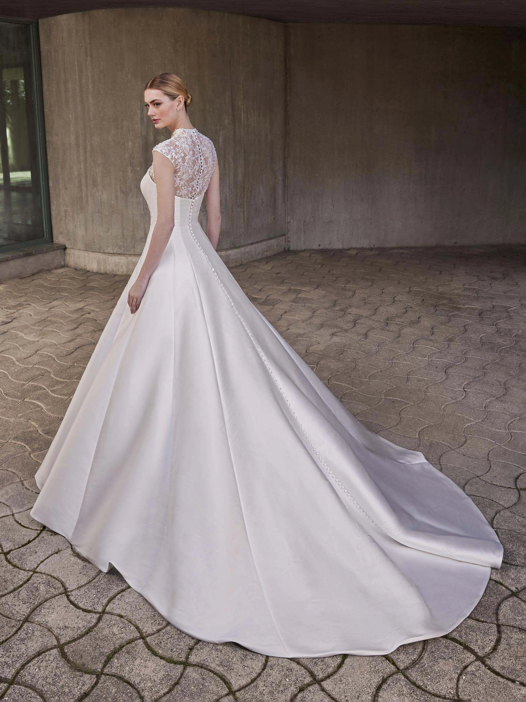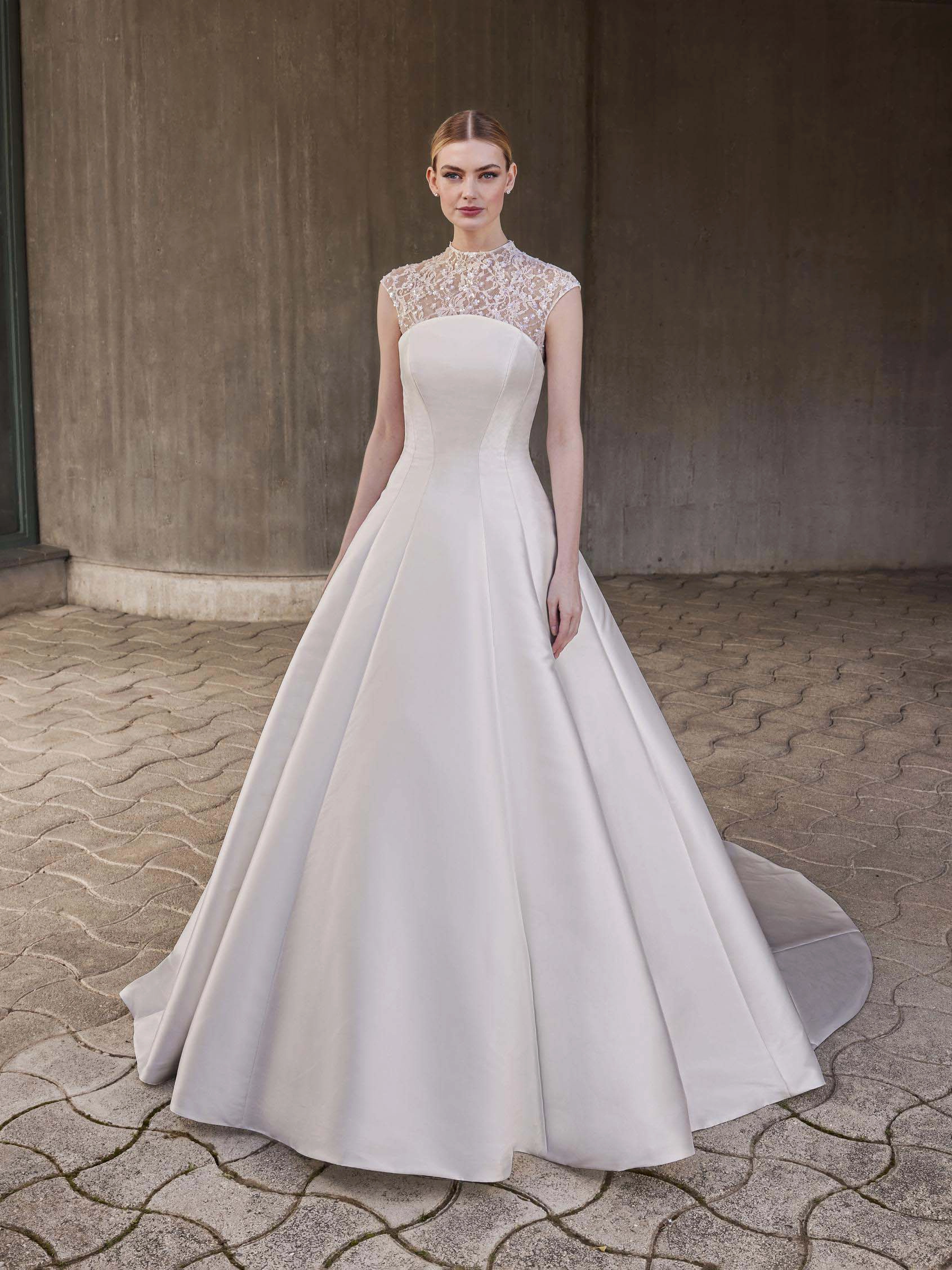 CARLOTTA es un modelo by PRONOVIAS. Un vestido en mikado suave que irradia soltura y elegancia atemporal, con una silueta que destaca la pureza y la sofisticación perfecta para novias que quieren un look simple pero impactante. Además de eso, incluye un jacket extraíble.
