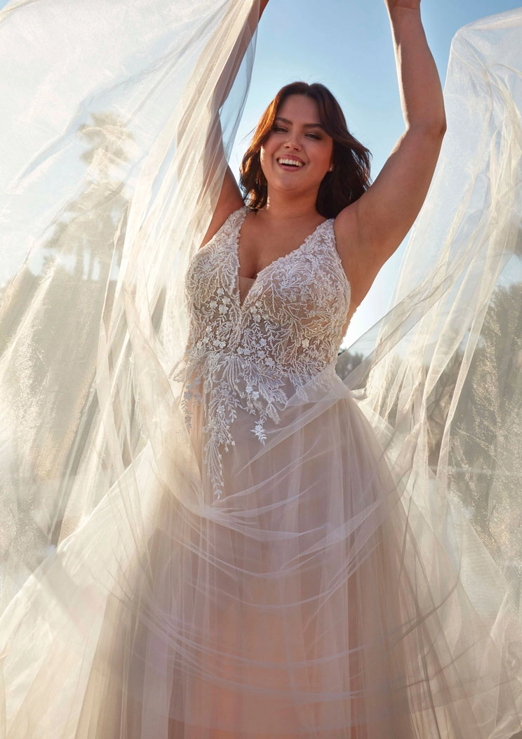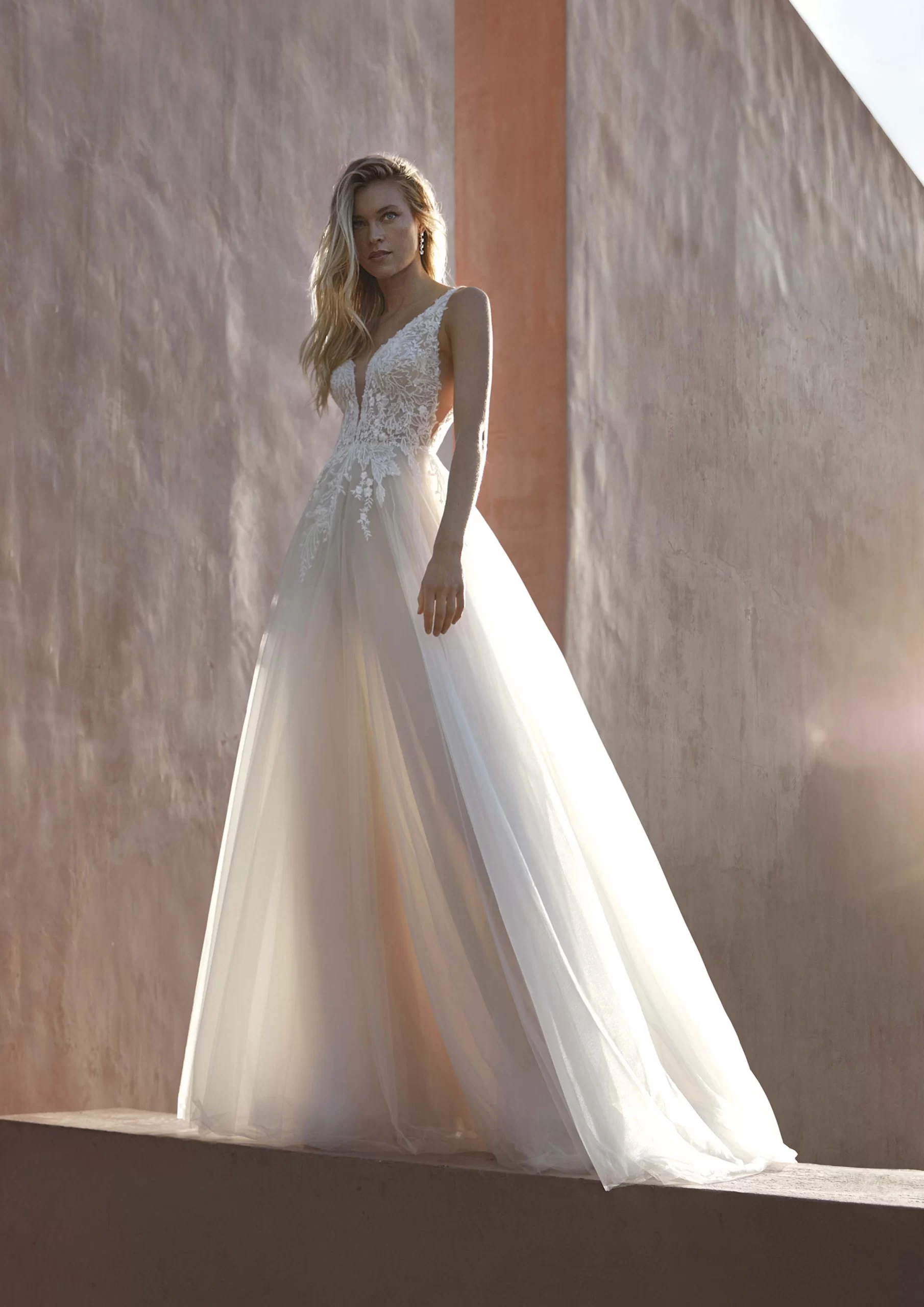 CRIMSON es un hermoso vestido en corte A, con escote en forma de pico y detalles de encaje. Lleva diseños florales, los cuales estarán en tendencia este 2025 y 2026. Es un modelo perfecto para una novia que desea un look de cuento de hadas. CRIMSON es un vestido by PRONOVIAS.