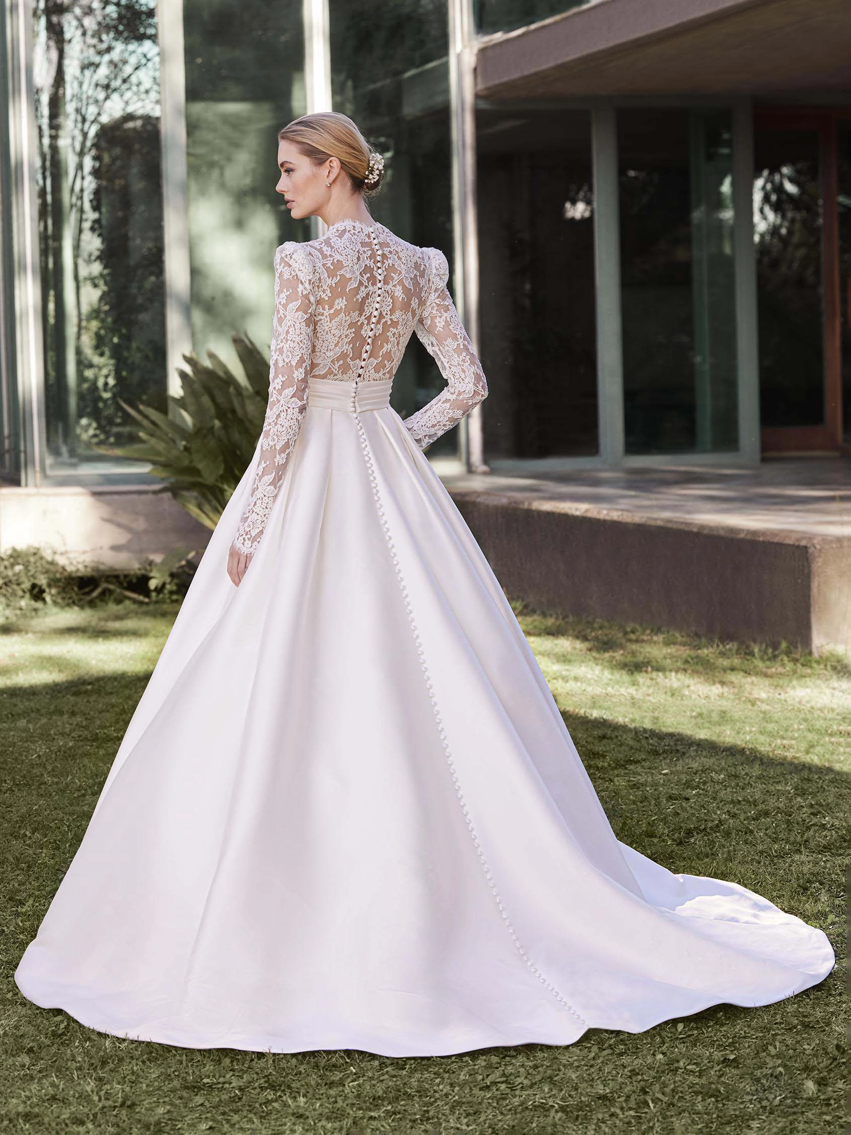 Vestido de corte princesa con escote en V y mangas largas, en mikado y chantilly con encaje cordón, que combina romanticismo y grandeza en un vestido de gran presencia. Ideal para una novia que desea que su gran día sea como un cuento de hadas. MASSY es un modelo by PRONOVIAS.