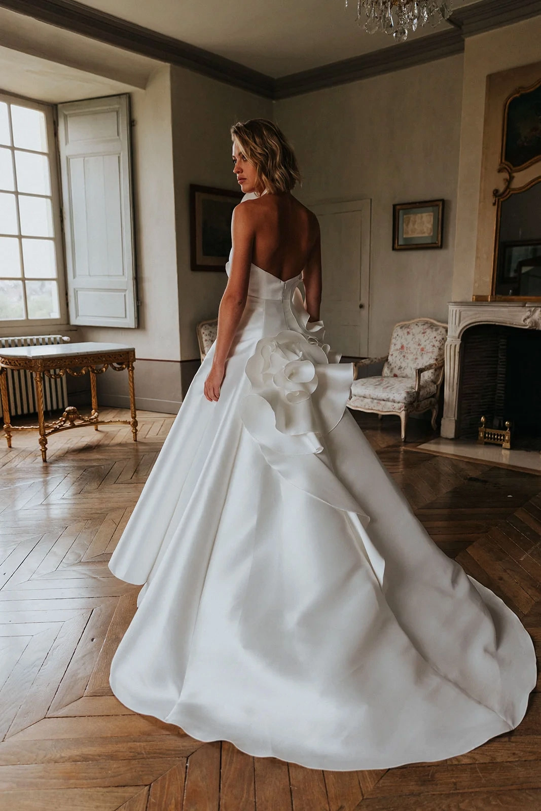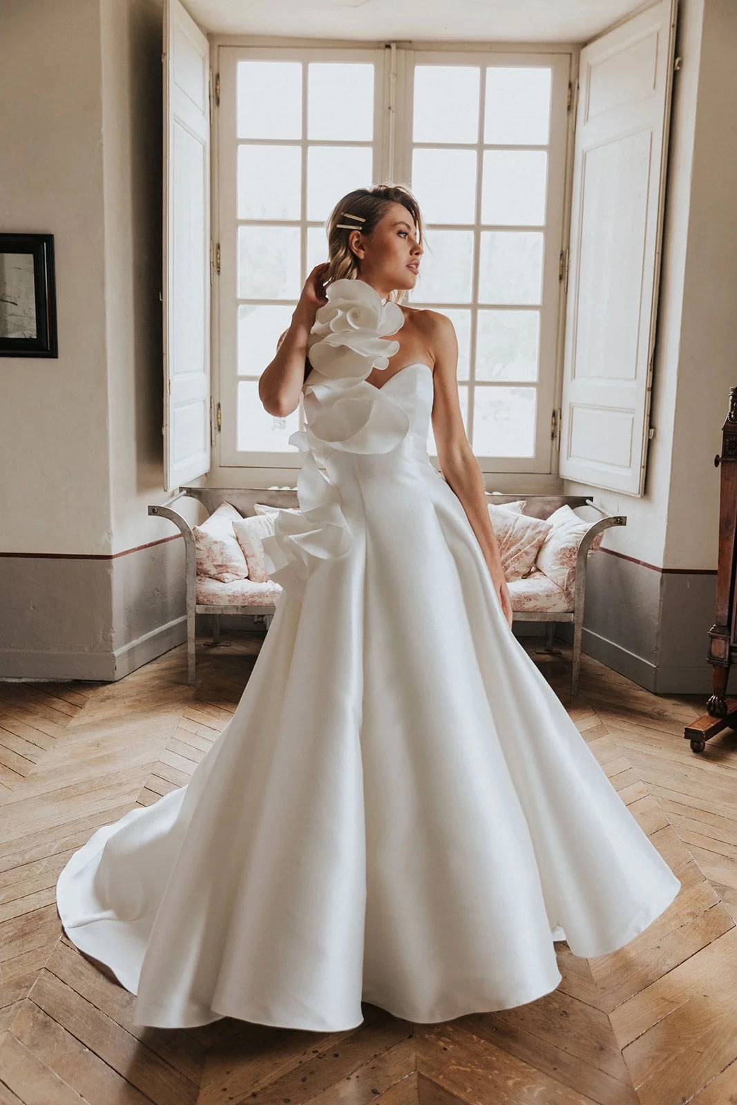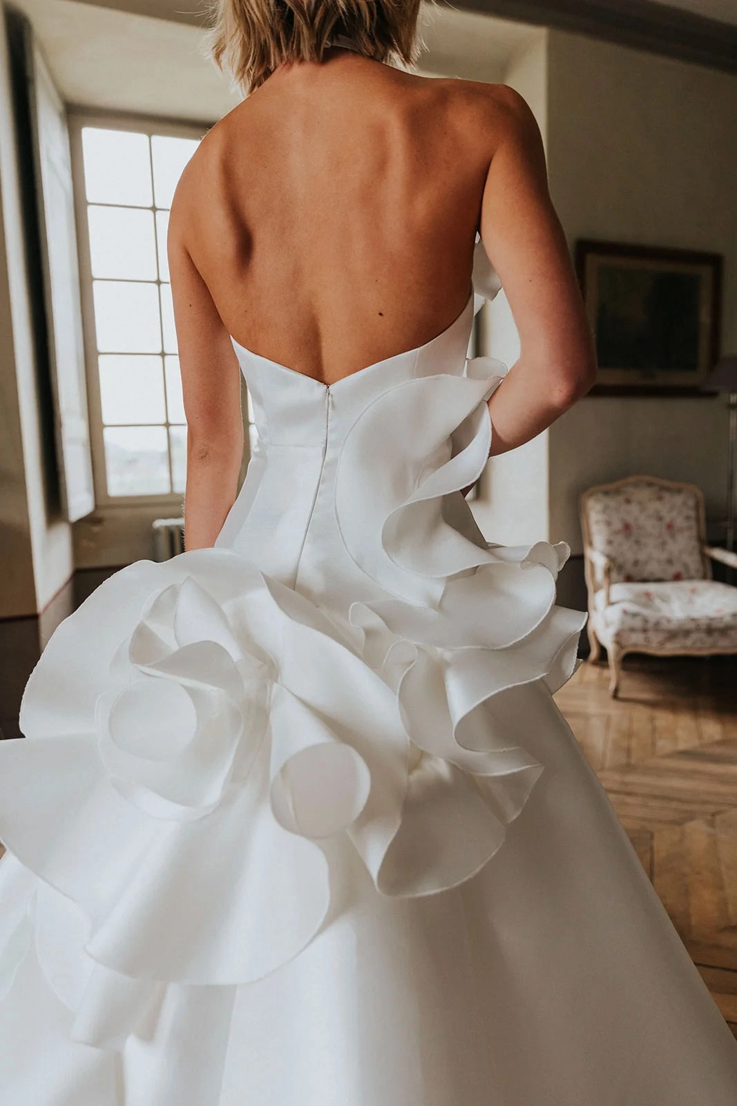 Renée es un hermoso vestido corte princesa que te hará sentir dentro de un cuento de hadas. Es un modelo de la firma francesa Cymbeline. Está confeccionado en mikado, tiene un escote corazón. Además de un incluir detalles en volutas con estampado floral. ¡Le dirás Sí al vertido!