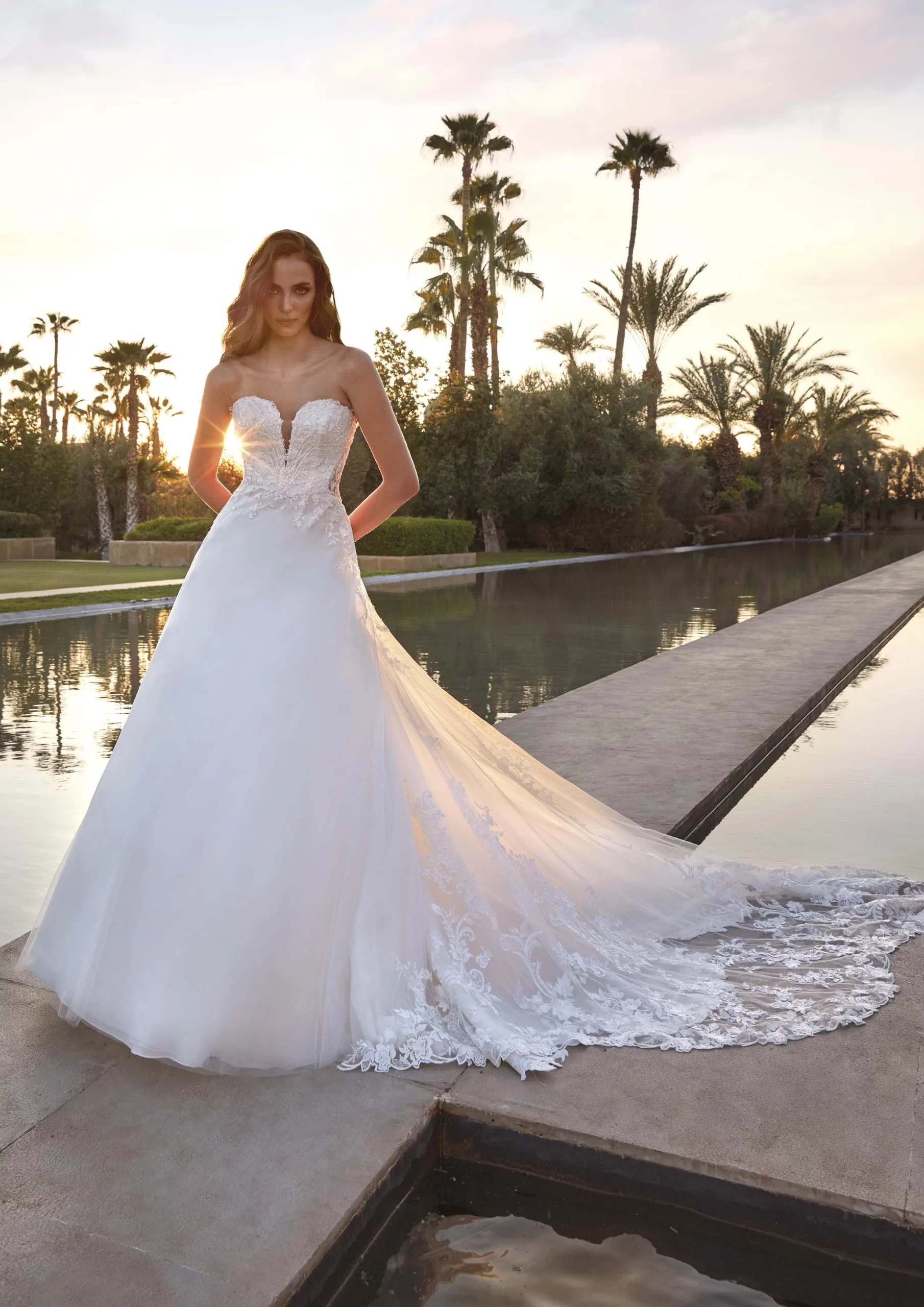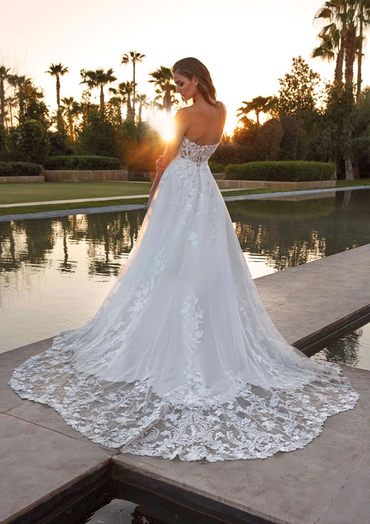Vestido en corte princesa, lleva un escote en forma de pico y está confeccionado en tul y encaje. Es un hermoso modelo clásico y elegante, perfecto para una novia que desea ser la protagonista de un cuento de hadas. RINNES es un modelo by PRONOVIAS.