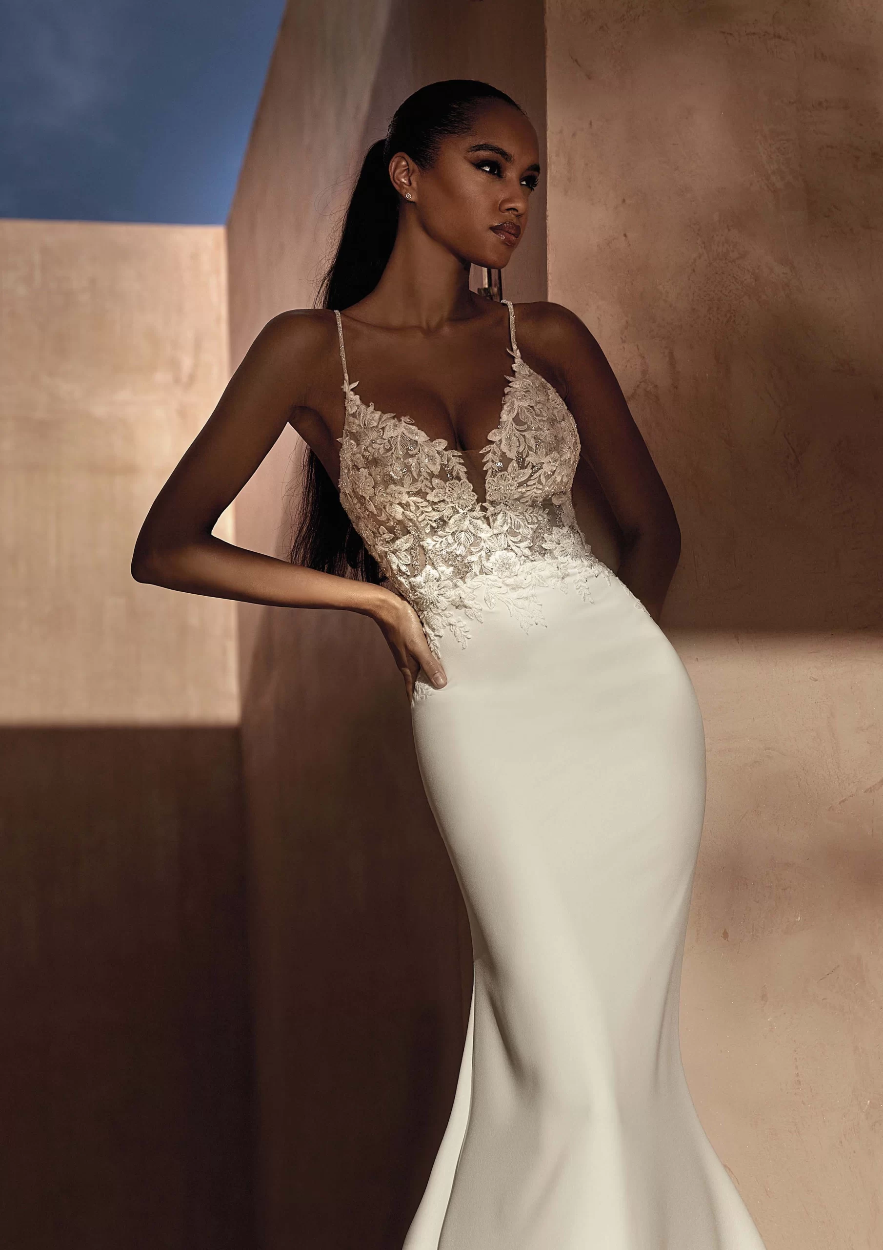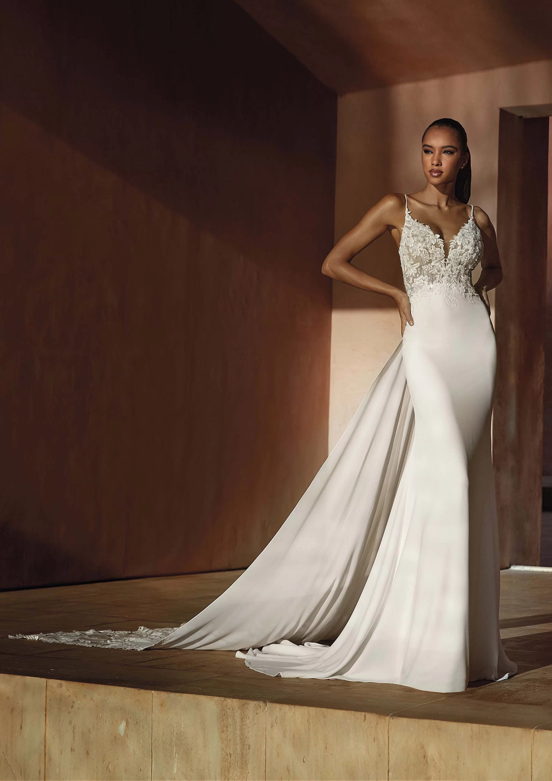ROMAN es un modelo by PRONOVIAS.  Es un vestido de novia corte sirena con escote de pico. Está confeccionado en crepe y no lleva mangas. Además de eso, lleva detalles de encaje que dan un look juvenil al vestido. Ideal para las novias que desean verse elegantes y modernas.