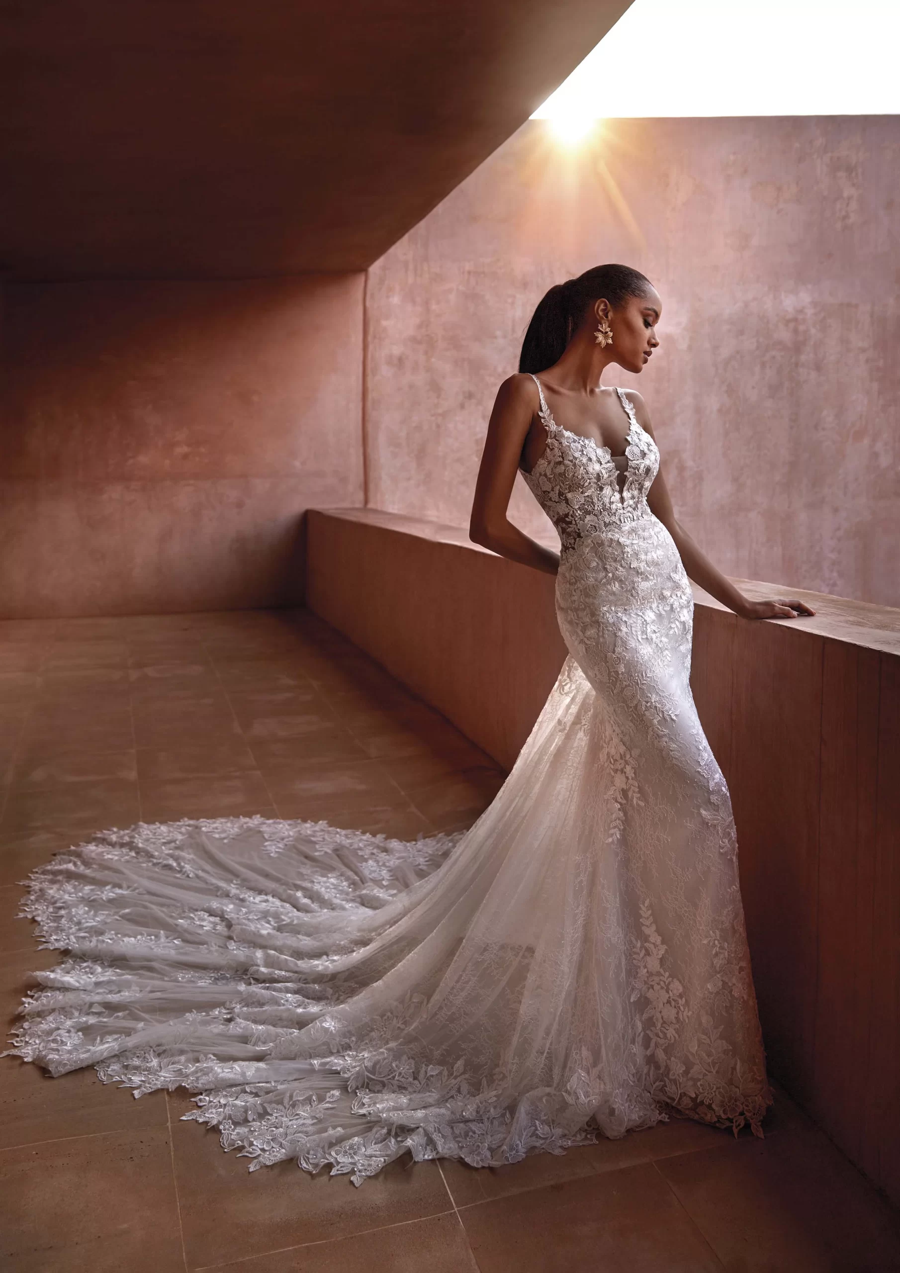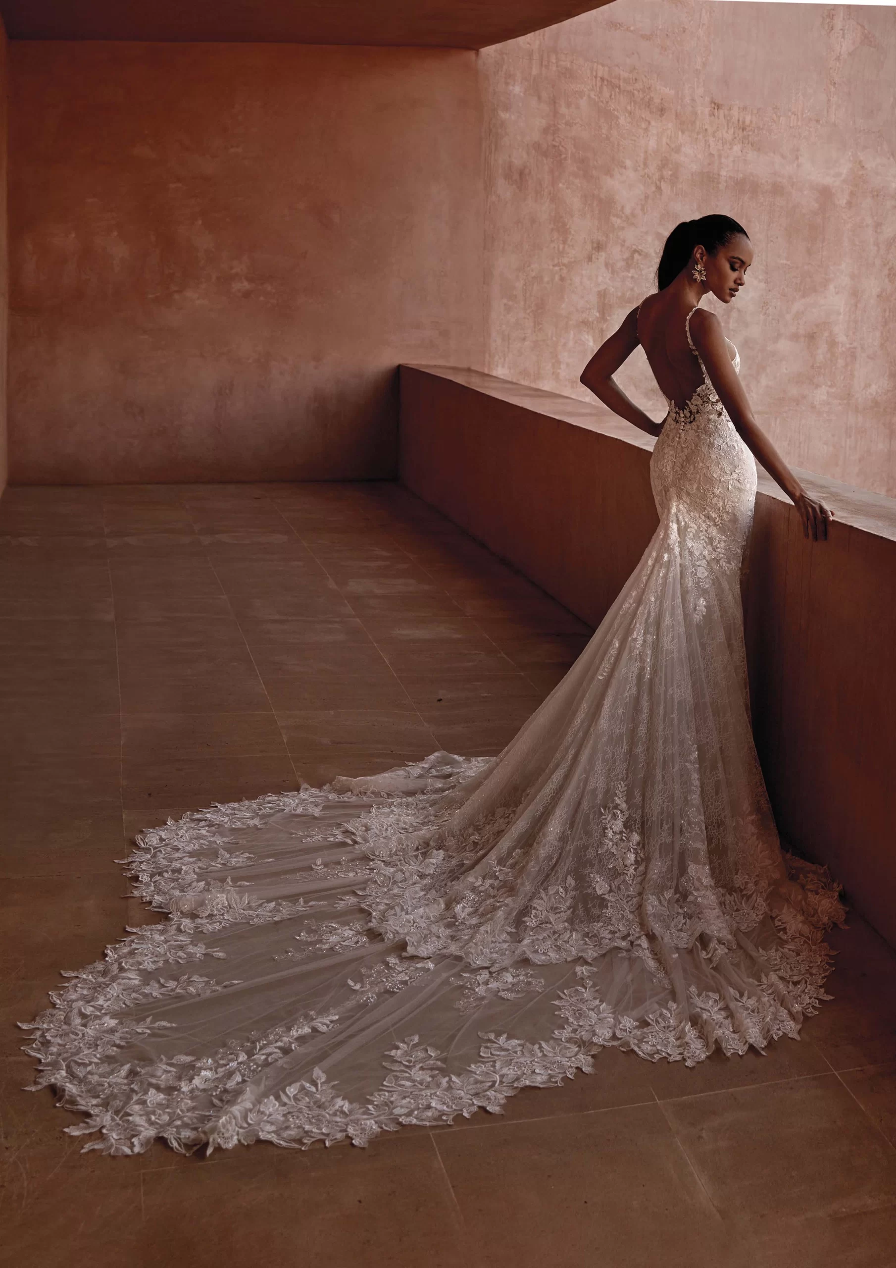 Vestido de novia en corte sirena, tiene un escote de pico. Todo el modelo está confeccionado con encaje y lleva una cauda en caída que le da una ilusión de cascada. Es un modelo ideal para una novia que desea verse moderna, audaz y atrevida. SEYCHELLES es un modelo by PRONOVIAS.