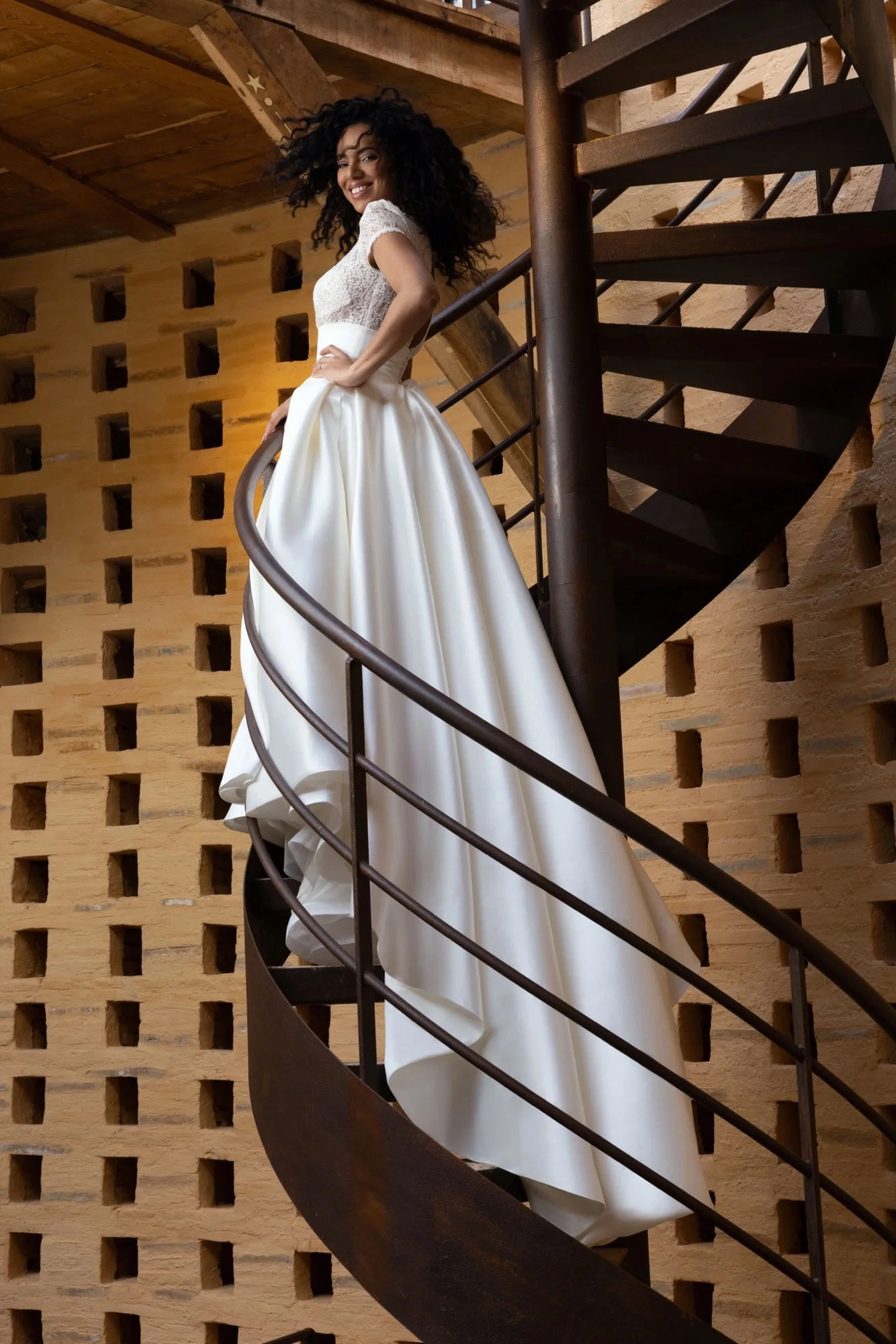 Un hermoso y elegante vestido de novia confeccionado en mikado, creación de la firma francesa Cymbeline. Con su corte princesa te sentirás en un cuento de hadas el día de tu boda. Tiene manga corta y detalles de encaje con motivos florales. Un vestido que amarás desde el primer vistazo.