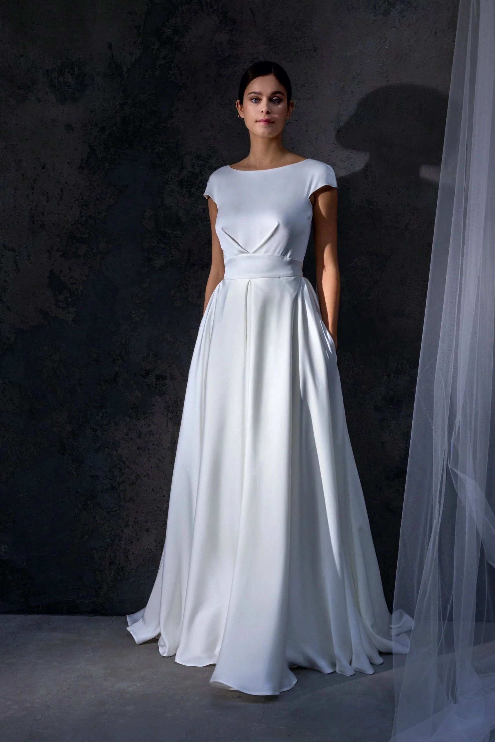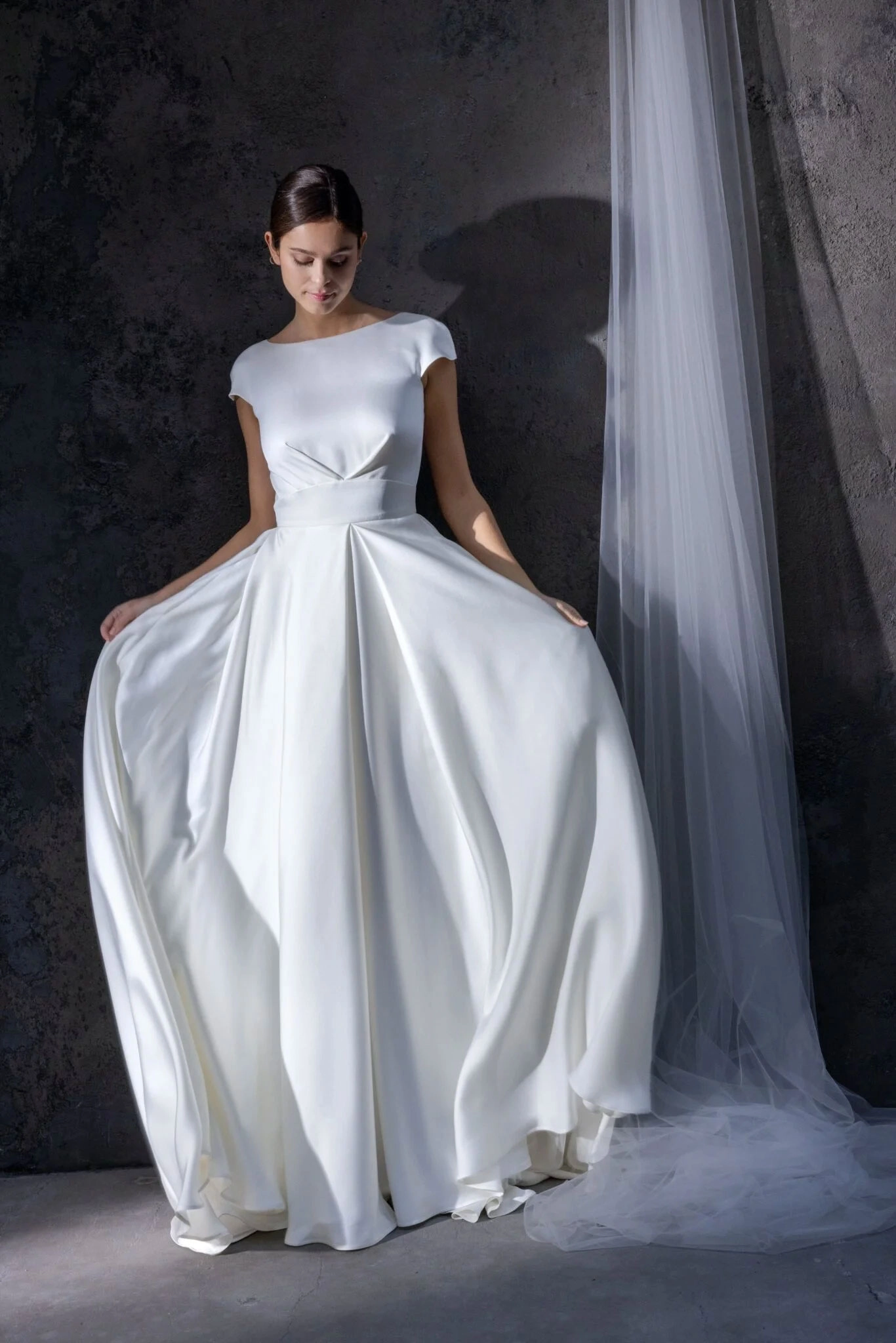 Trinity es un hermoso vestido de novia en corte A, confeccionado en crepé francés. Pertenece a la firma parisina Cymbeline. Tiene un escote redondo y una espalda escotada en V. Un elegante y refinado modelo europeo que te hará lucir espectacular el día de tu boda.
